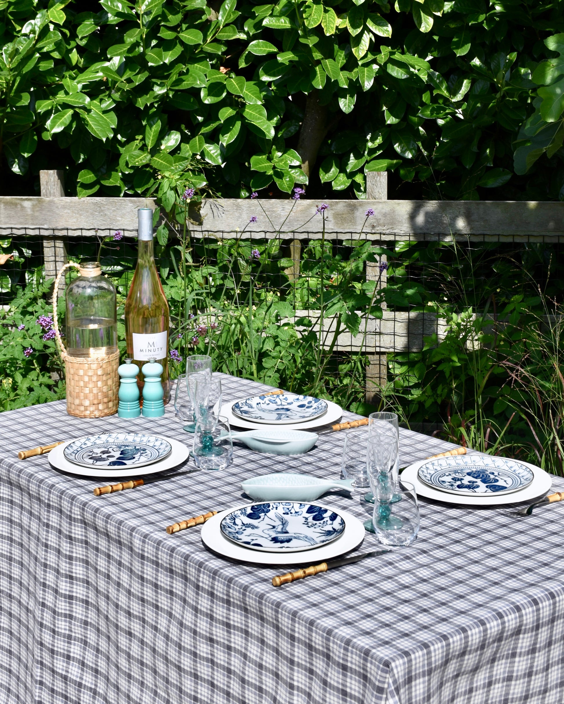 Handgemaakt tafelkleed met een blauw geweven ruiten design. Onder andere te combineren met de ecru servetten.