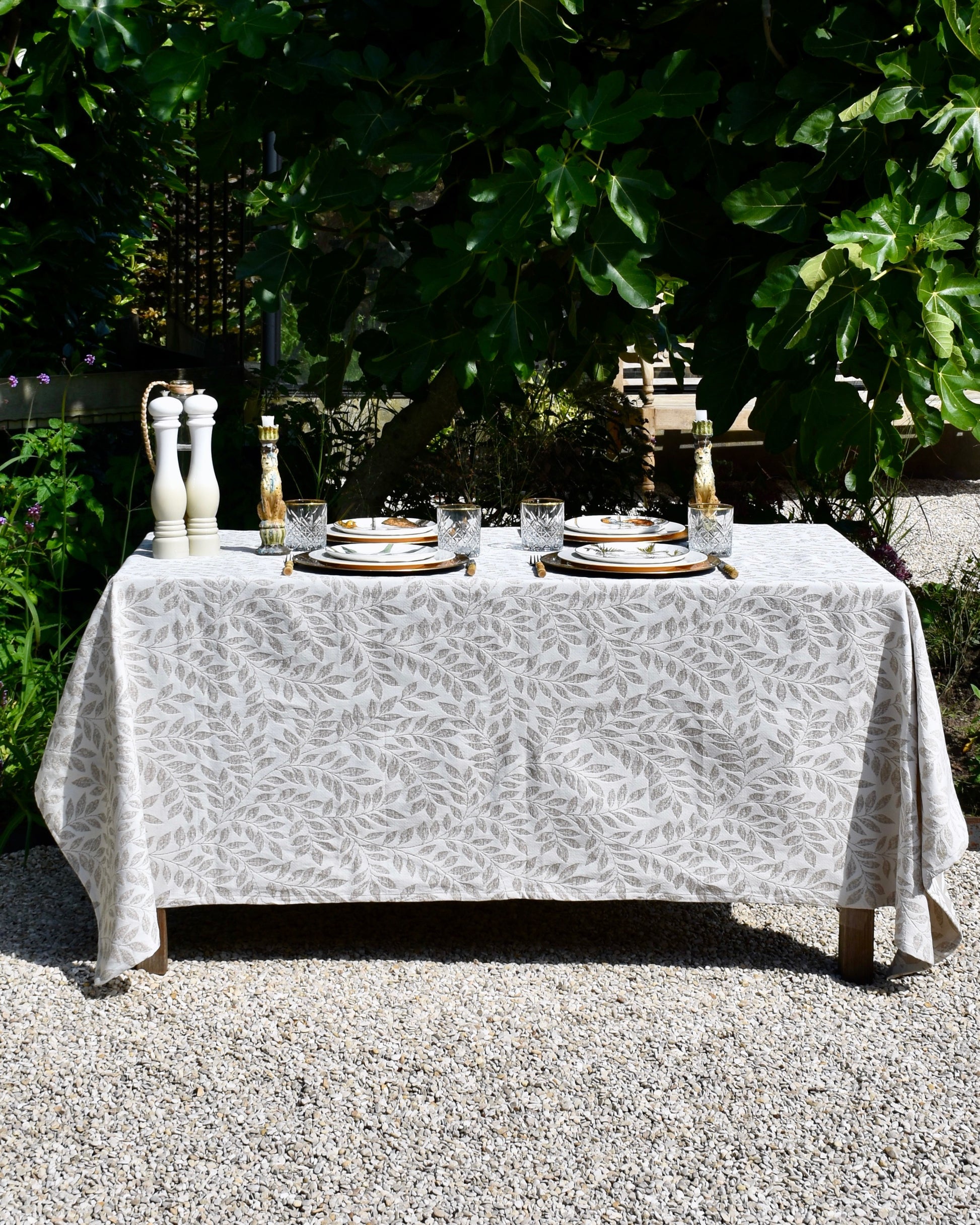 Handgemaakt jacquard tafelkleed met een grijs geweven bladeren design. Onder andere te combineren met de beige servetten.